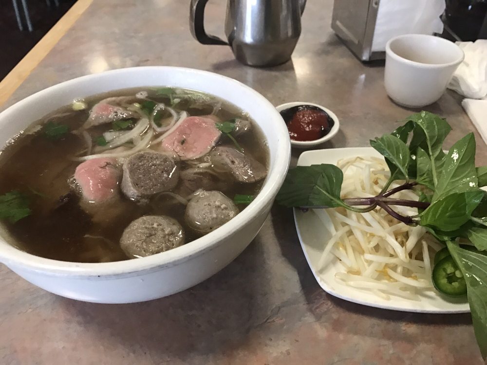 Three huge sprigs of basil, good broth, lots of tender meats on the combination #1 large bowl. Fresh crispy sprouts, juicy lime and spicy jalapeno pepper. Fast friendly service, great location near the freeways. Easy parking. Clean restaurant. I have no complaints!